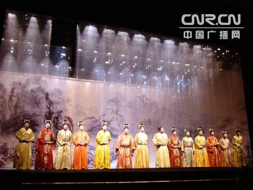 (插播一段抄的演出报道:这幅“明朝山水”高8米、宽16米,是由三十层“凝脂膜”叠加而成,错落有致地描绘出了明朝的江山,其三维效果让原先平面的山水画更富立体感,尤其是从台下往台上看,更显宏伟。一般的画作展出供人欣赏都是静态的,然而一旦作为舞台布景,配合演员的表演则让画作更为生动,两者可谓是相辅相成。排练时,当最后一幕让明朝历代16位皇帝共同伫立于这片“山水”中时,画家夏小万也是激动不已。)